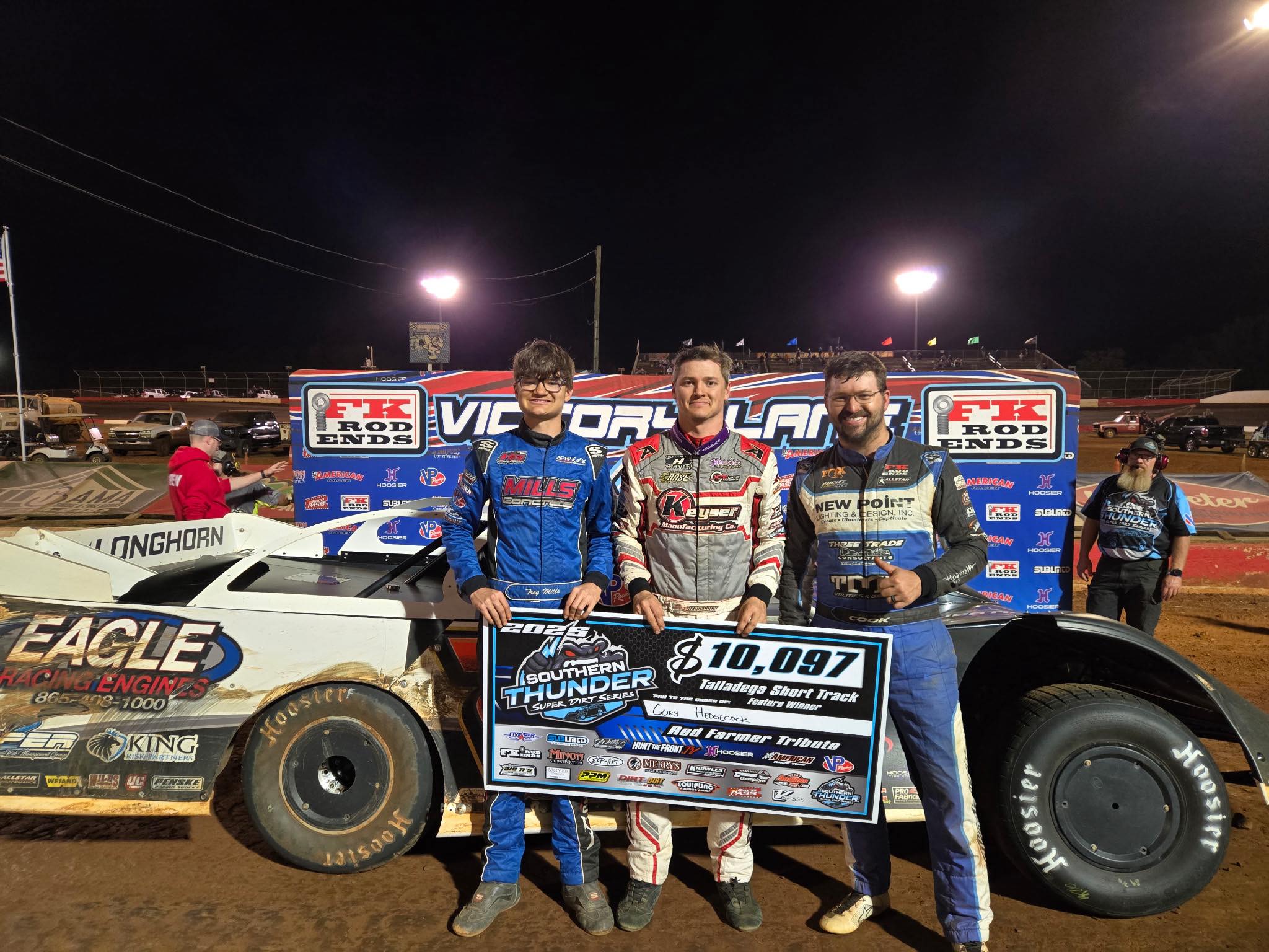 October 19, 2025 – – – Cory Hedgecock’s 2025 win total now stands at ten following a $10,097 triumph in the annual ‘Red Farmer Tribute’ race on Saturday night, October 18 at Talladega Short Track in Eastaboga, Alabama! Cory clicked off the fastest lap in Group B during Southern Thunder Super Dirt Series qualifying and